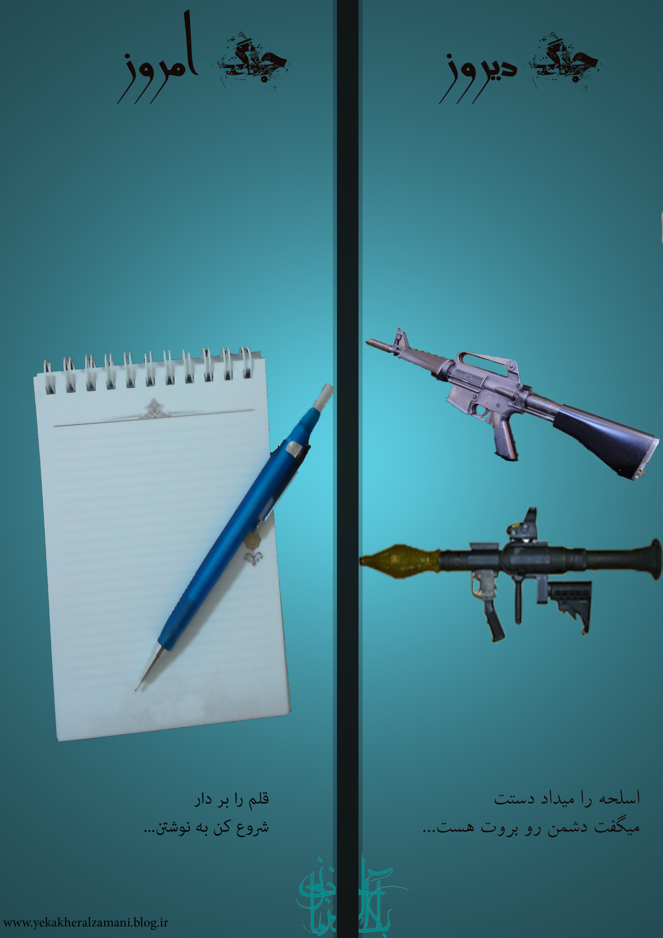 طرح نوشت:زمان جنگ اسلحه میدادن دستت میگفتن دشمن روبروته اسلحه را برمیداشتی میرفتی جلو و چه میکشتی و کشته میشدی پیروز بودی و اگرم نمیرفتی جلو تنها ضرری که میدیدی این بود که آسمانی نشدی.